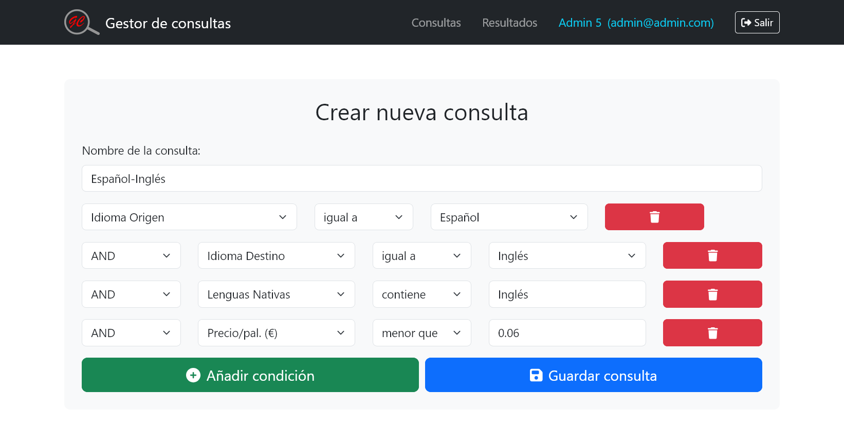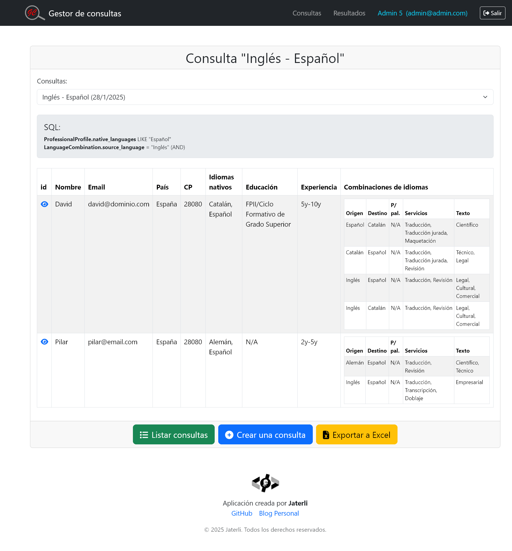 - Crear consultas personalizadas: Filtrar traductores según idiomas, experiencia, disponibilidad, etc.