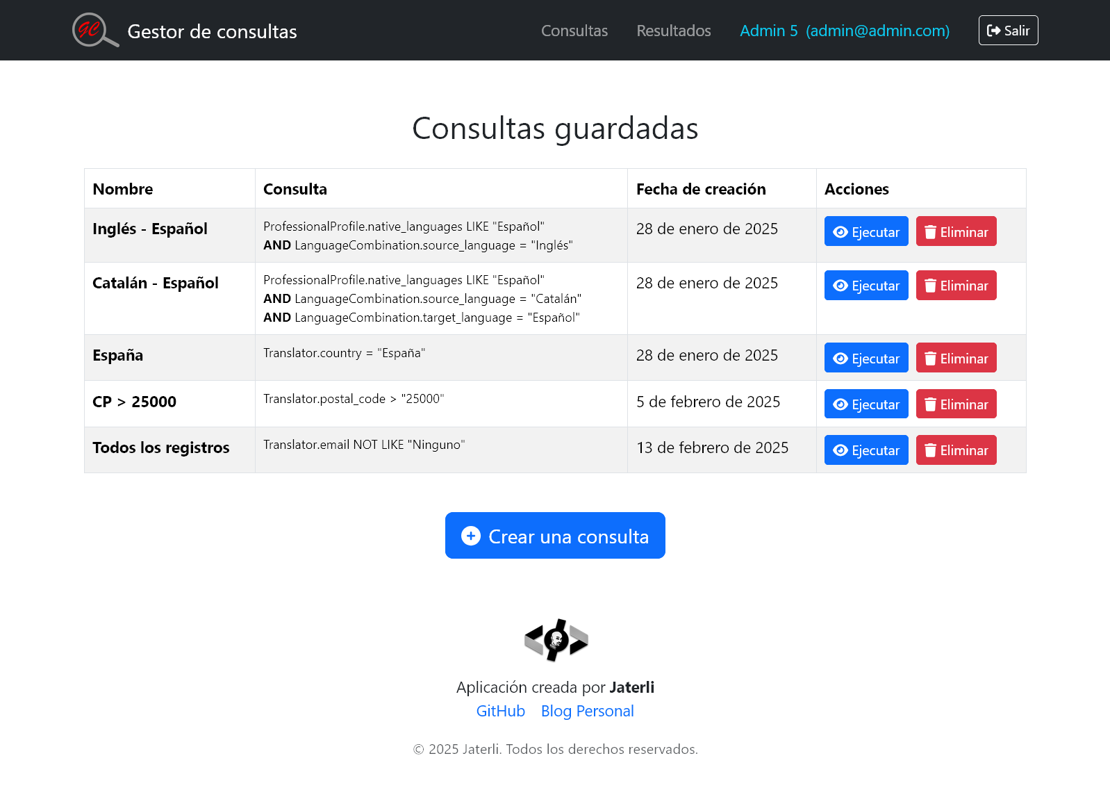 Esta aplicación, desarrollada con Django en el backend y React + TypeScript en el frontend, es una herramienta diseñada para gestionar perfiles de traductores profesionales y permitir a los administradores realizar consultas personalizadas sobre la base de datos. Su arquitectura modular, escalabilidad y facilidad de personalización la convierten en una solución ideal para empresas que buscan optimizar la gestión de profesionales.